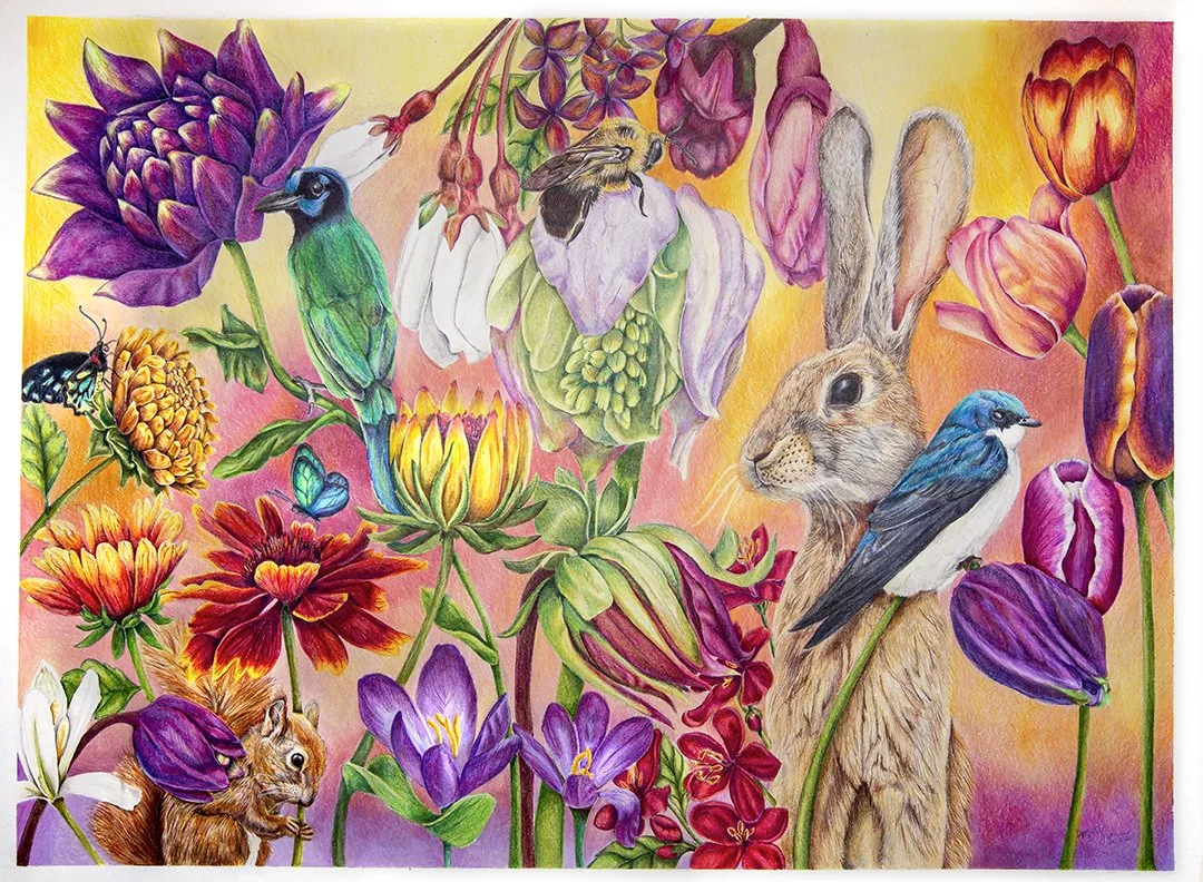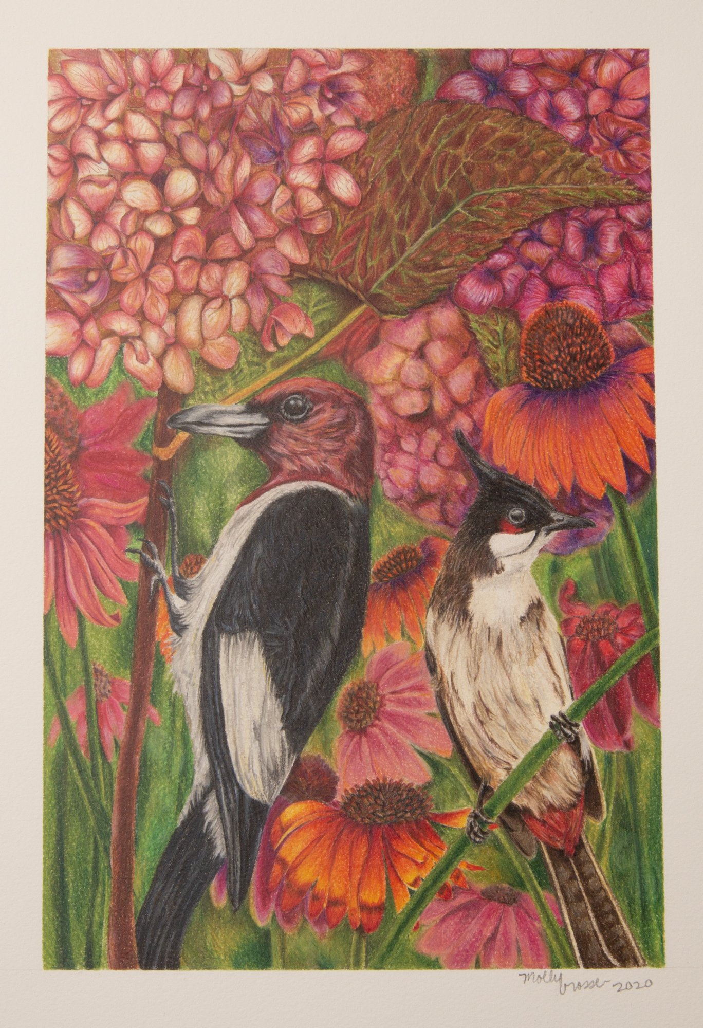 Add “Three Birds, Three Flowers” as an original colored pencil drawing or Giclee print to your collection by clicking the button.